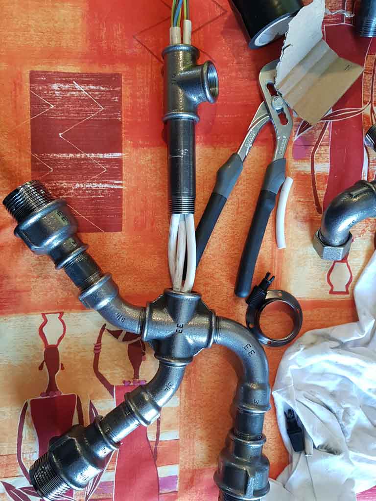 Comme toute la lampe est en métal, il est important que je câble aussi la terre. Au début je suis parti sur 3 fils distincts, mais j’ai rapidement compris que juste le fait de les passer dans les tubes en métal, et de tourner les pièces, allait vraiment les abîmer. Je suis donc passé à un câble incorporant les 3 fils.