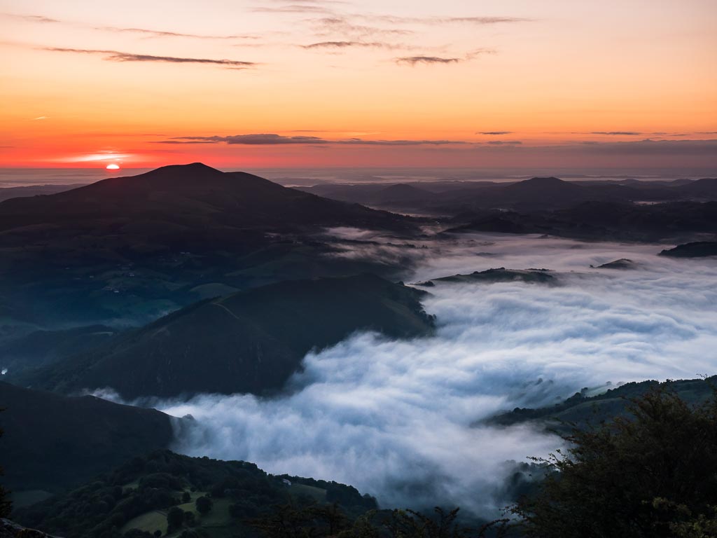 Le Mondarrain est une petite montagne d’à peine 750 mètres de hauteur, ne présentant aucune difficulté, surtout du point de départ que j’ai choisi. L’ascension se fait en 45 minutes à peine, de nuit à la frontale. Ça tombe bien, car l’objectif n’est pas de faire une randonnée à proprement parler mais plutôt de chercher un joli point de vue pour faire de jolies photos du lever du soleil.